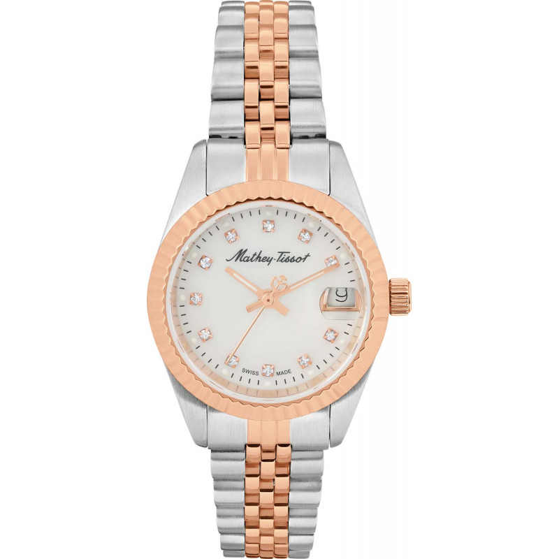 Silver-tone stainless steel case with a two-tone (silver-tone and rose gold-tone) stainless steel bracelet. Fixed rose gold-tone stainless steel bezel. White dial with rose gold-tone hands and index hour markers. Minute markers around the outer rim. Dial Type: Analog. Date display at the 3 o'clock position. Ronda Caliber 585 quartz movement. Scratch resistant mineral crystal. Pull / push crown. Solid case back. Round case shape, case size: 26 mm. Fold over clasp with a safety release. Water resistant at 50 meters / 165 feet. Functions: date, hour, minute, second. Additional Info: zirconia. Mathy II Series. Casual watch style. Watch label: Swiss Made. Mathey-Tissot Mathy II Quartz White Dial Ladies Watch D710RA.