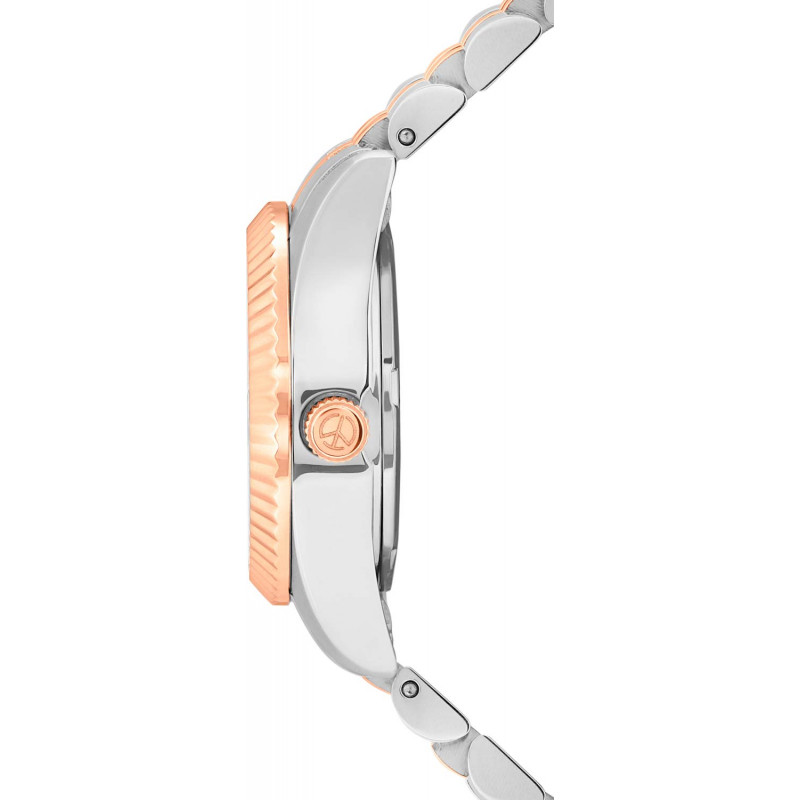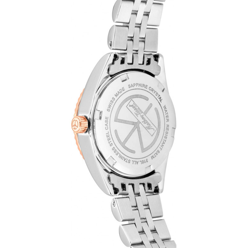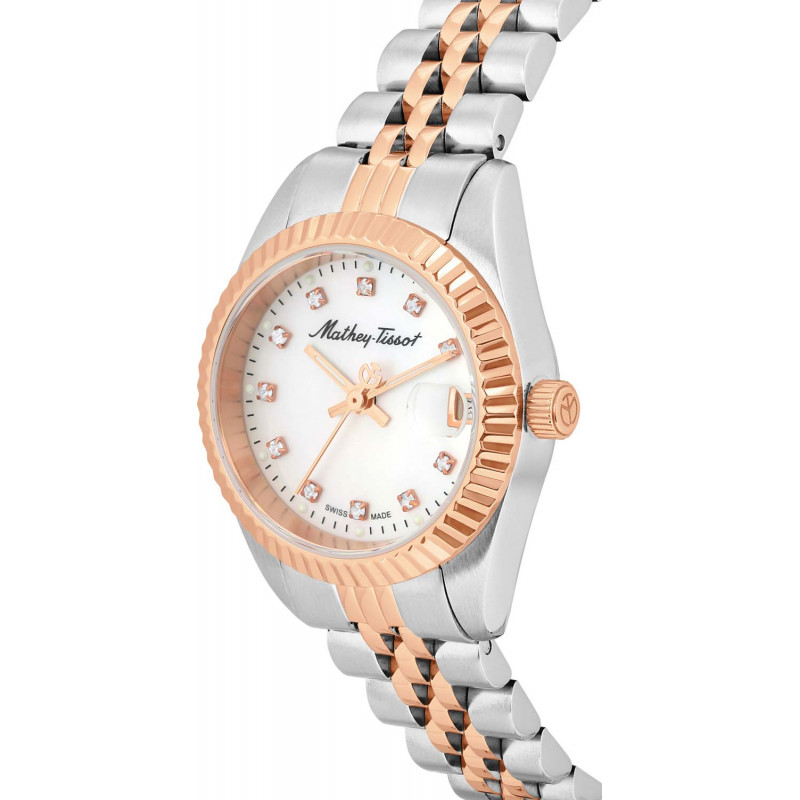 Silver-tone stainless steel case with a two-tone (silver-tone and rose gold-tone) stainless steel bracelet. Fixed rose gold-tone stainless steel bezel. White dial with rose gold-tone hands and index hour markers. Minute markers around the outer rim. Dial Type: Analog. Date display at the 3 o'clock position. Ronda Caliber 585 quartz movement. Scratch resistant mineral crystal. Pull / push crown. Solid case back. Round case shape, case size: 26 mm. Fold over clasp with a safety release. Water resistant at 50 meters / 165 feet. Functions: date, hour, minute, second. Additional Info: zirconia. Mathy II Series. Casual watch style. Watch label: Swiss Made. Mathey-Tissot Mathy II Quartz White Dial Ladies Watch D710RA.